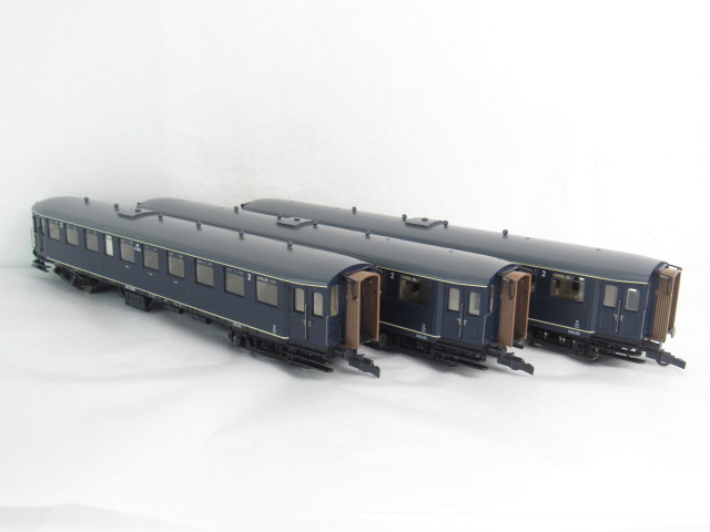 Wagenset met drie Blokkendoos-rijtuigen voor de Nederlandse Spoorwegen.
