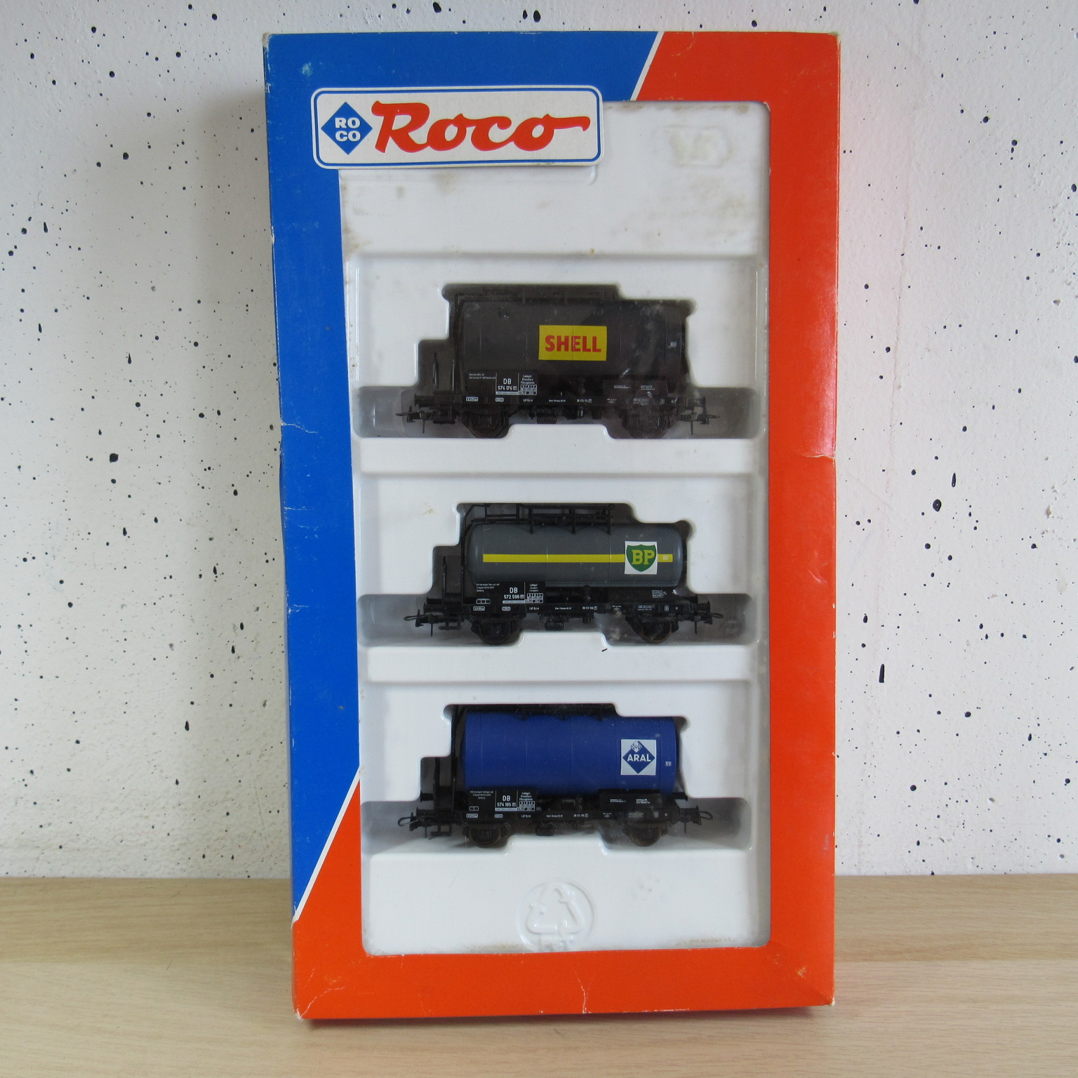 Roco 4337E DB Aral ketelwagen in ovpRoco 4337E DB Aral ketelwagen in ovp, Licht gebruikt, hekjes voor is los.